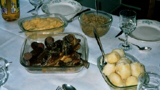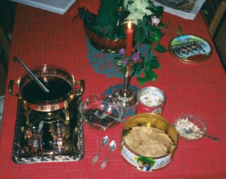 This a traditional Christmas drink, Gløgg. It is served warmed with crused almonds, raisins, nuts, and mixed with redwine. It smells of Christmas! We drank it the day before Christmas Eve at my host-grandmother's home with spice bread. Christmas in Norway is celebrated after 5 o'clock, when the church bells ring all over the country, on Christmas Eve. My family had a traditional meal of cured (salted) rib of lamb before exchanging gifts, all on Christmas Eve. In the old times, Christmas lasted 20 days, but now it ends on New Years.