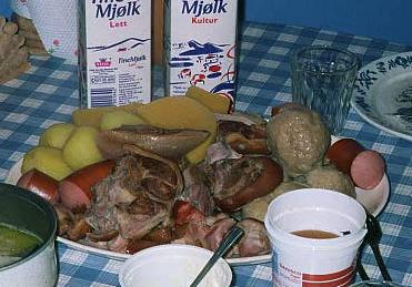 This is a photo of our Christmas food, "ribbe." It is salted rib of lamb and tastes so good. It is served with potatoes, rutabaga, and sauage.