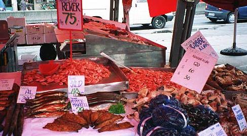 The local fish market in Bergen. Here one can purchse live fish and lobsters from a open tank, or one can purchase fresh salmon with prawns.