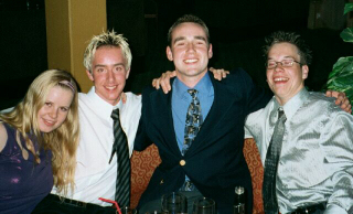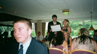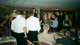 In this picture, we are giving our teacher, Bernard Hole, a little present to remember us by.