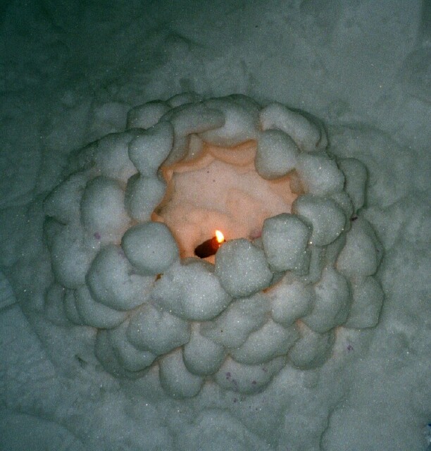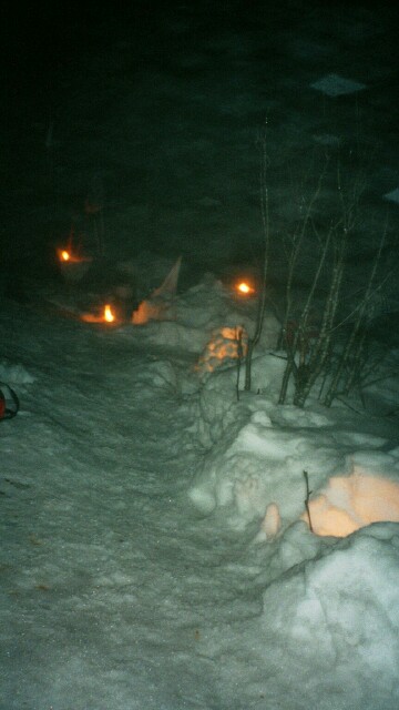 Candles were placed in the snow are markers for us to walk. In the dark of the night, it made a very cozy slight.